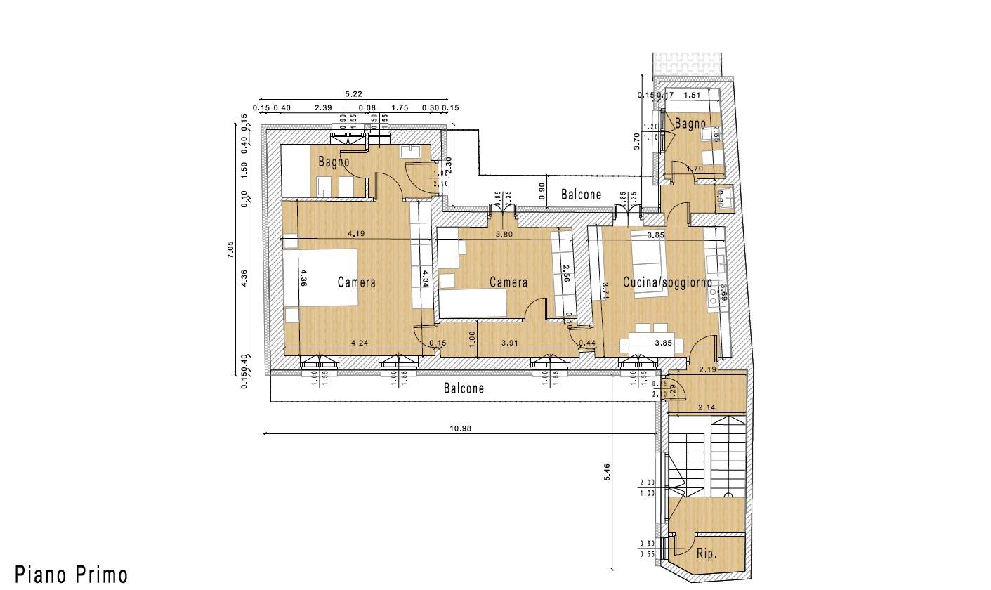 L’appartamento si trova al primo piano ed ultimo ed è composto da ampia zona giorno con soggiorno e cucina, 1 grande camere da letto, due bagni finestrati: uno riservato alla camera matrimoniale, l’altro a servizio della zona giorno.